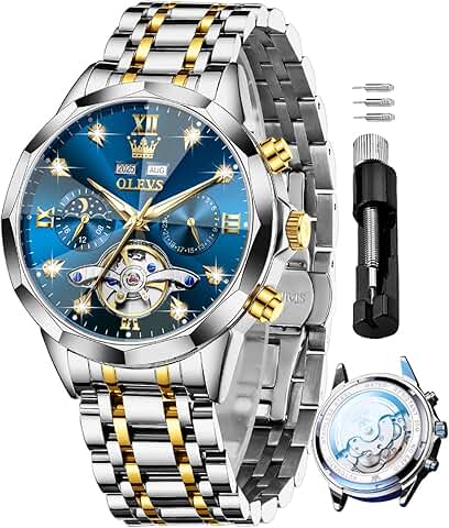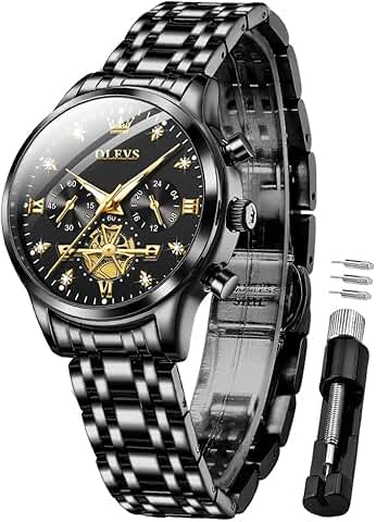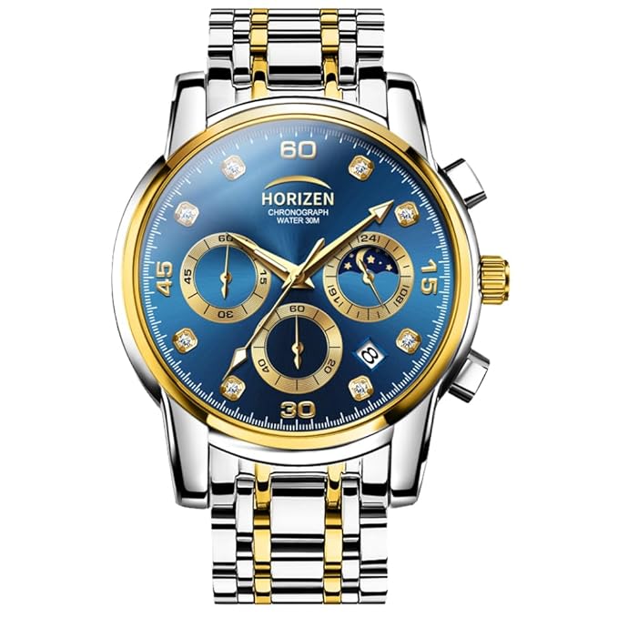 This OLEVS chronograph blends diamond-detailed markers, a two-tone stainless steel body, and a moon-phase display to give your wrist a truly refined presence. With its precise quartz movement, luminous hands, and 3 ATM water resistance, this watch delivers accuracy, durability, and all-day confidence. The butterfly-lock steel strap adds a premium feel, making it perfect for business, everyday wear, and any moment where you want your style to speak first.